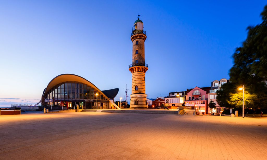 Direkt am Leuchtturm von Warnemünde befindet sich ein Platz mit dem markanten Teepott-Gebäude und einem Schwimmbad. Dieser Ort wird oft übersehen, liefert aber gerade zur Blauen Stunde großartige Motive.
