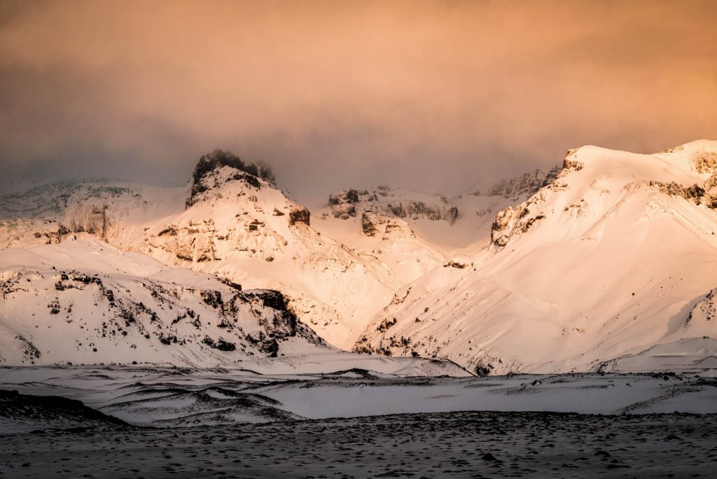 Danach ging es weiter Richtung Süden. Am Svínafellsjökull prüften wir, ob es sich lohnen würde, zu bleiben, entschieden uns dann aber, dem Licht hinterherzufahren. Diese Entscheidung zahlte sich aus. Wenige Kilometer später entdeckten wir eine Bergkette und das Licht explodierte förmlich. Innerhalb von Minuten wechselte der Himmel von Grau zu intensivem Rot und Orange. Wir fuhren schnell wieder zum Gletscher zurück. Trotz vereister Straße und steckengebliebener Autos schafften wir es rechtzeitig und konnten das magische Abendlicht auf dem Eis festhalten.