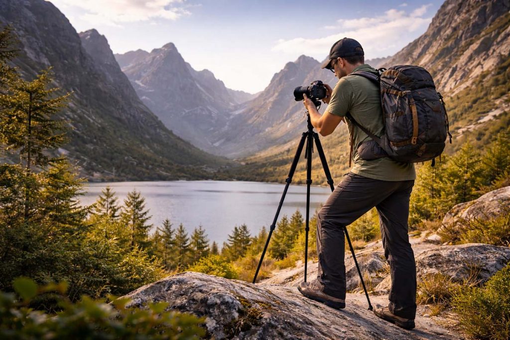 Auch das Gelände und die Umgebung spielen eine große Rolle. In der Landschaftsfotografie steht man selten auf einem ebenen Weg. Oft bewegt man sich über Felsen, durch feuchtes Gras oder auf schmalen Bergpfaden. Deshalb muss die Kleidung von Landschaftsfotografen nicht nur warm, sondern auch robust und beweglich sein. Gerade beim Fotografieren aus niedrigen Perspektiven oder beim Wechseln der Position ist Bewegungsfreiheit entscheidend.