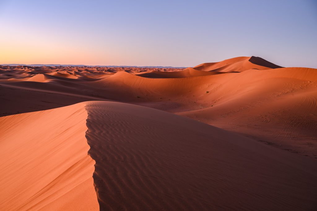 Zur blauen Stunde verwandelte sich der Himmel in ein tiefes Orange, das sich sanft im Sand widerspiegelte. Die Dünen wirkten noch wärmer und noch intensiver. Der Wind hatte feine Linien in die Oberfläche gezeichnet – perfekte Strukturen für eine klare Bildkomposition. Genau hier zeigt sich, wie sehr das Fotografieren in Marokko von Licht und Timing abhängt. Fünfzehn Minuten später sah die Szenerie bereits vollkommen anders aus.